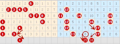 说实话1-20号数字这个区间我是不看好的,但是丢了有巨大可惜。还是来选几个号吧。分析前几期出号毫无章法,那么我们选号也不能用以往的选号技巧去选,换一种风格。1-10号区间,比较看好4号数字,它以前两期形成了虎口形式,预出率还是大的。5-11号数字区间我们等过几期出号了再来选吧。这里就不考虑选好了。纵观上期出号遗漏8期的数字有4个,不知道这期会不会开出一个,这里先选个15号数字以待观看。