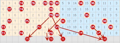 看上图中29号数字对应的斜连出号有25 31这两个号码,本期应该是要出一个的。这里就先定31号数字防25号数字吧。38号数字有两个3斜连指向,预出率还是可以,我是比较看好的。
