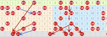 上图中43号数字也是有3个三斜连指向,预出率还是大的,所以这里先定43号数字。44号数字可以防一手。50号数字类型前面已经说过,这里已做一个防守吧。54号数字属于空一跳类型,所以一时比较看好的。56号可以选,前面50号做防守,这里53号就可以精选了。