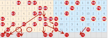 上图中61号数字属于重号下空一跳,这种类型的最近出的比较多,这里也是比较看好的。在前几期中64 66这两个号已经同时有5期没有出来了,这期应该会落一个号,先定64号数字吧。69号数字属于重号空一跳类型,这种类型最近出的也是比较频繁,所以还是比较看好的。73号数字在上期的三斜连中没有出来,那么这期同样的三斜连会不会出的,个人感觉预出的概率还是大的。在上期开出了77号数字这个冷号。一般冷号下面不会出重号,会出邻号,这里比较看好76号数字。78号数字在考虑考虑。