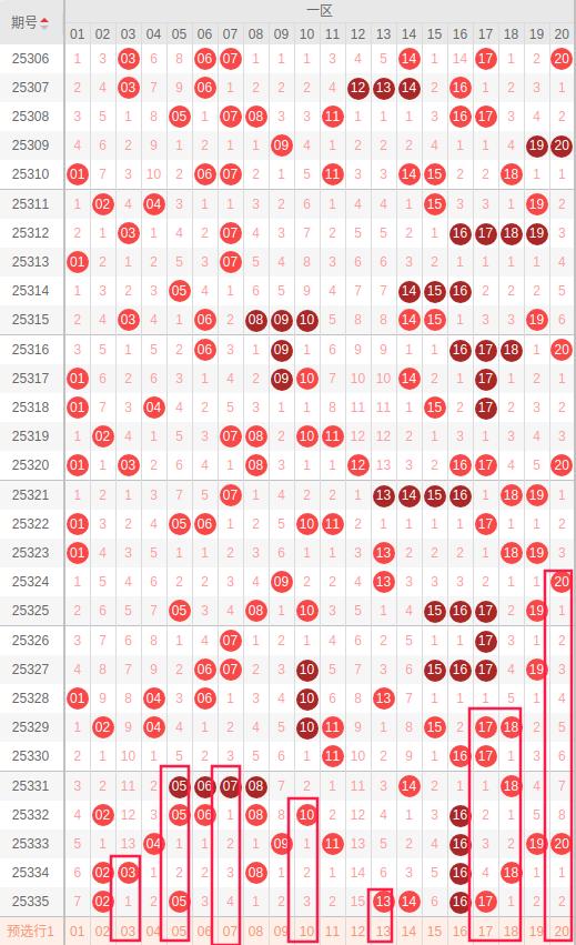 一区:最近一区10期出号情况为:2 7 5 7 3 6 6 6 5 6,总出号情况为53个,平均出号5.3个,本期推荐一区号码回补推荐出号为:03 05 07 10 13 17 18 20。重点关注:05 07 13 17。