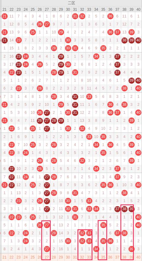 二区:最近二区10期出号情况为:5 7 4 5 8 5 4 7 6 3,总出号情况为54个,平均出号5.4个,本期二区号码还是比较弱势推荐:27 32 33 35 38 39。重点关注:32 35 38。