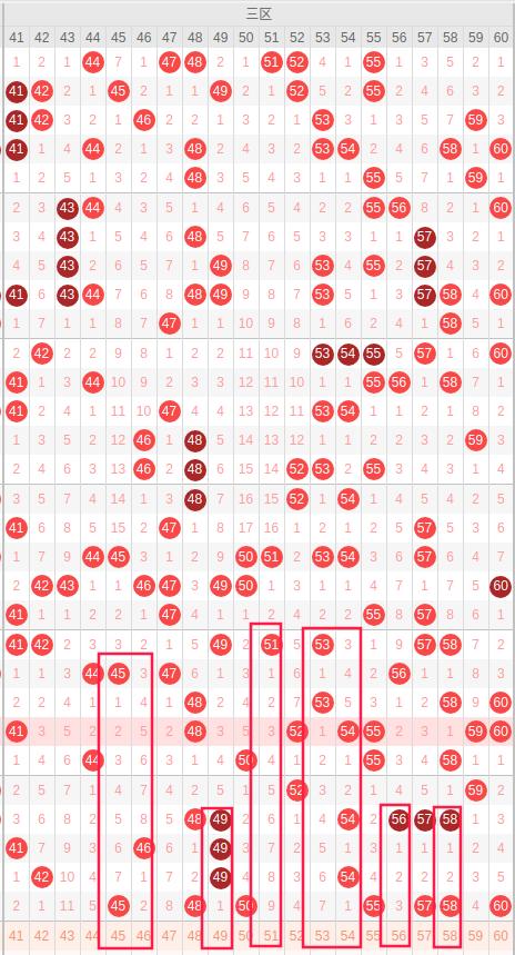 三区:最近三区10期出号情况为:7 4 4 7 4 2 6 3 3 7,总出号情况为47个,平均出号4.7个,本期三区号码走势比较不错推荐:45 46 49 51 53 54 56 58,重点关注:45 46 49 51 54 56 58。