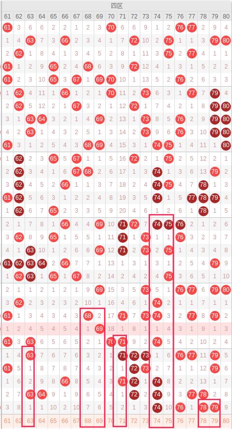 四区:最近四区10期出号情况为:6 2 7 1 5 7 4 4 6 4,总出号情况为46个,平均出号4.6个,本期四区号码推荐:63 68 69 71 74 75 78 79。重点关注:68 69 71 75 78 79。
