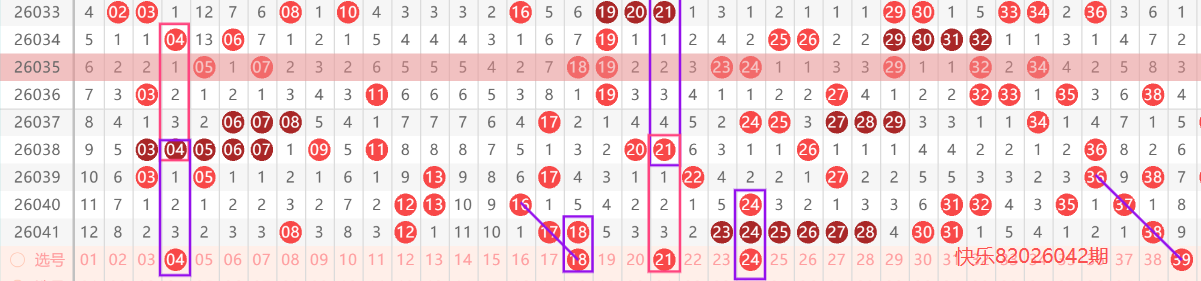 - 热号(保底核心):近30期内出现≥9次的号码(如高频号"04、24"在30期内出现≥10次)
