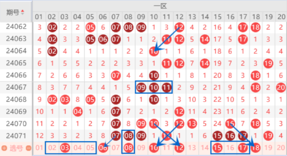 本期的02 03 04 05号数字应该是要出号了,本期不出,下期03 05我们就可以定一胆码了,看本期出不出。 本期的06号数字是属于遗漏8期的号码,本期遗漏8期的号码有三个,我们要注意出一个号码的情况。上期开出了07 08 09和15 16 17号数字的三连号,按照以往的惯例,每组都是要有重号的,我们要重点关注一下,这里我们重点关注一下07 08 15 17号数字出重的情况就行了。本期的10 12号数字是属于交叉对称号码,我们注意出一个号码的情况。本期的18号数字我们可以做一下防守的,有可能复制上面的走势。