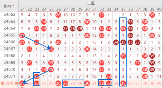 本期的23号数字我们注意一下走重的情况。本期的26号数字我们关注一下出号情况,上期的24 25号数字都没有出重,那么本期的26号数字是有机会出的。本期的27 28 29号数字可以定一个胆码出了,我们重点关注一下27 28号数字出一个号码的情况就行了。本期的33号数字我们注意一下走重的情况。本期的35号数字走的是11号数字的走势,都是属于3113走势,可以防守一下。