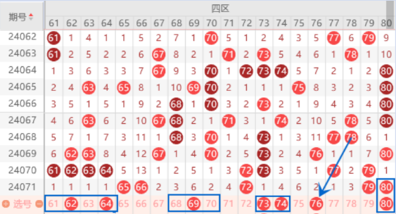 该区间的4连号61 62 63 64号数字上期没能走出重号,本期我们注意一下落号情况,重点关注一下62 64号数字出一个号码的情况。本期的68 69 70号数字也是有机会开出一个号码来的,重点关注一下68 69号数字出一个号码的情况就行了。本期的74号数字我们防守一下,在其他走势图上看走势是挺好的。本期的80号数字我们防守一下出重的情况。