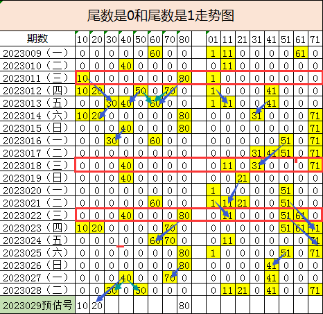 二连号开出60形成了一个L形走势,80开出5次,而在尾数0走势上,