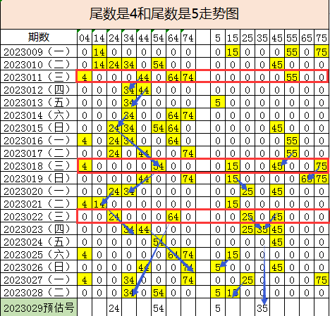 号码54在同周期内开出过一次,尾数5的号码没有太多的明显走势,