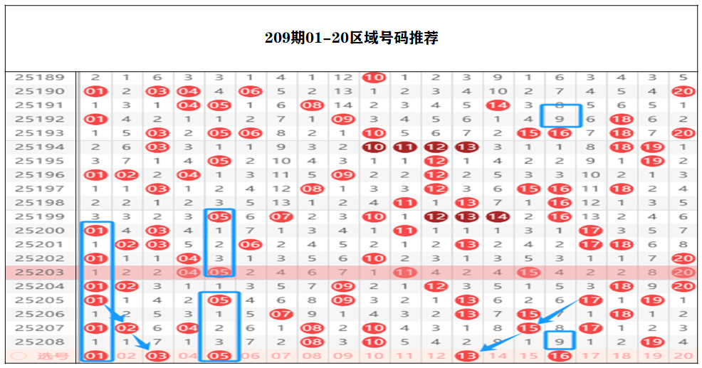 快乐8第209期。01~20区域的推荐。如上图。首先是01号,是个完美的对称走势。接下来是我们的03号,具备一个01间隔一期出02再间隔一期出03的间隔走势。下来是13号,是从17号间隔一期出15,再间隔一期出13,同样是一个间隔走势。最后就是19号上下间隔都是一个9期,一个对称间隔。剩下的交给你们自己来选择。