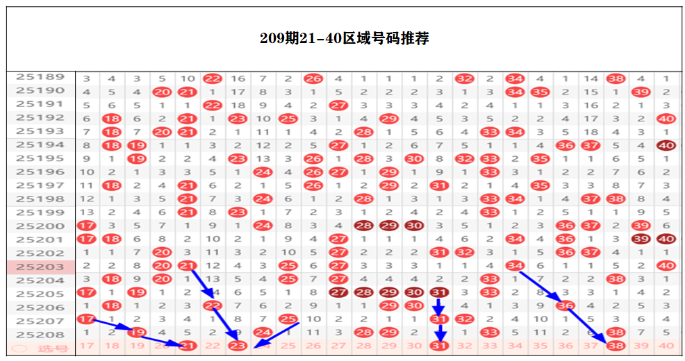 20~40区域,我们推荐的第一个号码是21号,我们可以看到17号间隔一期出19号,再间隔一期出21号这样的一个斜连。然后第二个号码就是23号,从21间隔两期出22,再间隔两期出23。同时还具备一个25~23的斜连。下来是31号,上下间隔对等,又具备一个3 4~3 1的间隔斜连。然后是我们的38号考虑重,剩下的大家根据自己的思路去整理。