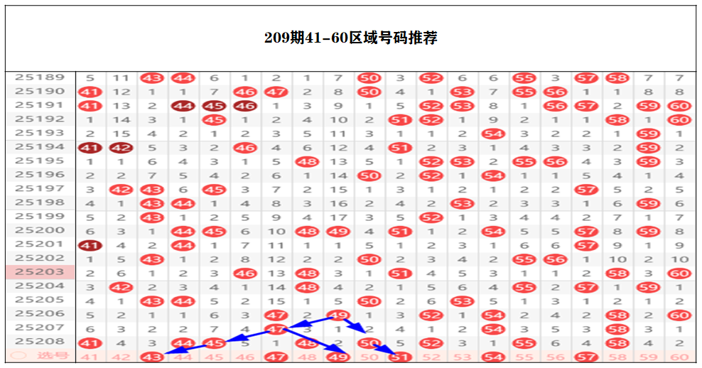 40到60区域号码相对来说比较少,因为上一期这个区域出现的号码比较多。本期推荐的第一个号码43号,我们可以看到是从49间隔一直走到43的间隔一斜连。接下来就是47号,考虑回补,然后是49号的斜连以及51号的斜连,54和57同样是按照回补形态来进行考虑。其余的号码你们根据自己的思路去选择,这里不多做推荐。