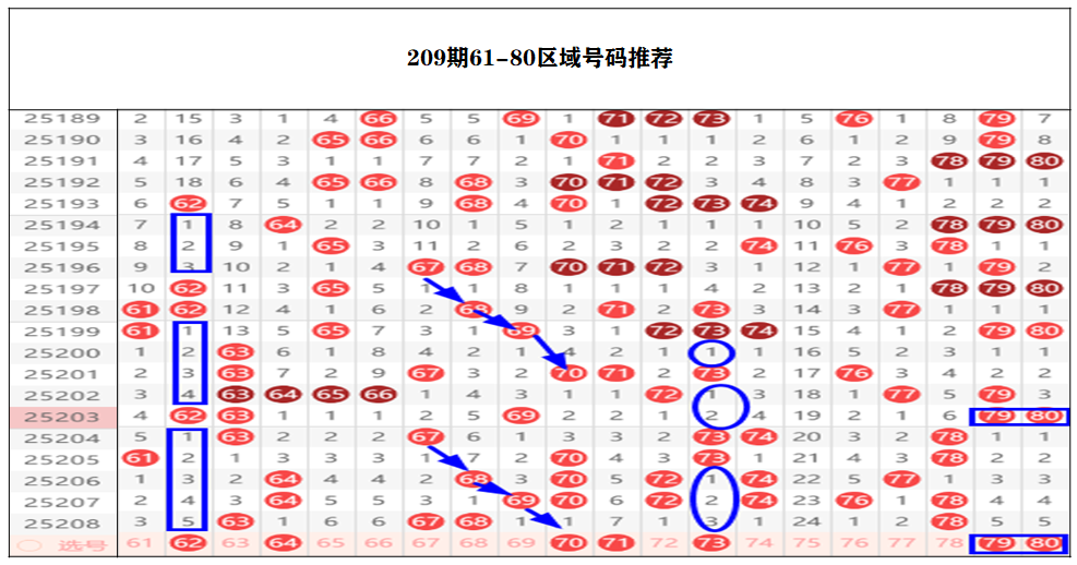 61到80区域,我们推荐的第一个号码是62号,它具备一个64到63再到62的斜连。同时它本身是一个间隔3、间隔4、间隔5的间隔递增走势。下来是64号,考虑回补,然后是我们的70.71号。根据蓝色箭头我们可以看出67间隔一期出68.69,然后再间隔一期出70带71。下面是同样的走势,67间隔间隔一期,出68.69再间隔一期,出70带71。73号是一个间隔递增的走势。79.80考虑回补,形成一个完美的括号。其余的号码,根据自己的思路去思考,这里不做推荐。