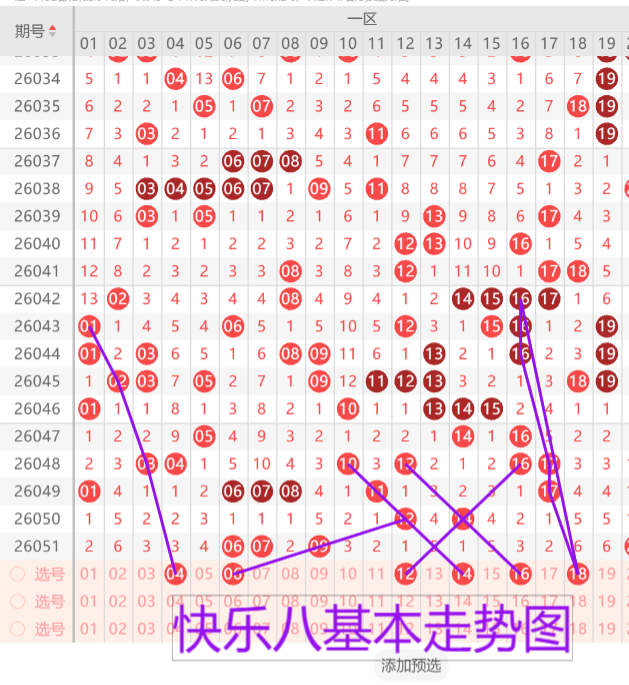 我们先来看下一区的基本走势情况,上期开出了四枚开奖号码,本期预计开出 3-4枚开奖号码,首先我们来看04的01 02 03 04的123斜连形态。06的三斜连重号形态。12 14 16 三枚号码的偶数平行斜连交叉走势建议三选一或者三选二。18的321形态如图所示。