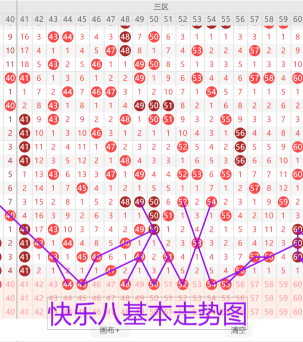 我们来看下三区的基本走势及情况,上期开出了三枚开奖号码,本期预计开出4-5枚开奖号码,首先我们来看41 47开出的同路中心号44重点。45的平行斜连走势形态。48 50 52的三角叉走势建议三选一或三选二。52 54的交叉走势建议二选一。55的三斜连。