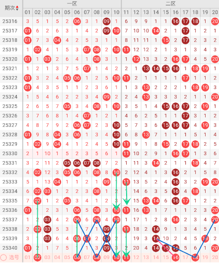 一区开出:01 09 奇偶比: 2:0 和值:10 跨度:8,上期开出2个号码,奇数号码占优势。本期无三斜连走势,隔码斜连走势:06 08 10,近10期平均出号3.3枚,本期推荐关注号码:02、06、08、10。