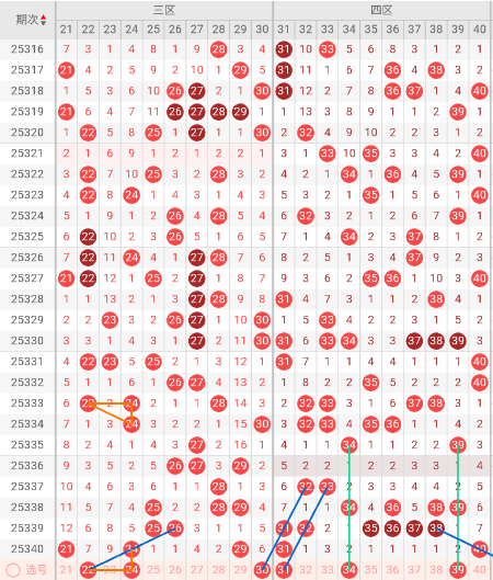 三区开出:21 24 29 奇偶比: 2:1 和值:74 跨度:8,上期开出3个号码,奇数号码占优势。本期无三斜连走势,隔码斜连走势:22 30,近10期平均出号2.3枚。推荐关注号码:22、24、30。
