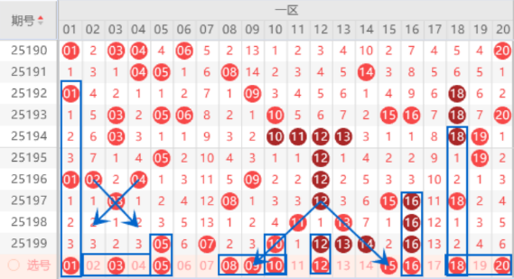 该区间的01号数字我们注意一下出号情况,属于空三对称号码,出号机会是有的。本期的03号数字我们防守一下出号情况,本期可以防守一下03 05号数字同出的情况。上期开出了05 07 10 12 13 14 16号数字,本期我们注意一下出重号的情况,其中的05 10 12号数字可以重点关注一下出号重号的情况。本期的08 09号数字我们注意一下出一个号码的情况,其中的08号数字可以重点关注一下,本期可以防守一下08 10号数字同出的情况。