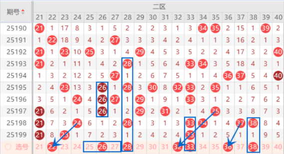 该区间的25 26 27号数字是属于重号26号数字边号回补号码,本期是有机会出一个号码的,其中的26 27号数字我们可以重点关注一下出号情况。本期的28号数字是属于121走势,本期是有出号机会的,我们可以防守一下28 32号数字或者28 33号数字同出的情况。本期的32号数字是属于斜四连号码,出号机会是有的,可以关注一下。本期的37 38号数字我们注意落下一个号码的情况,其中的38号数字可以重点关注一下。