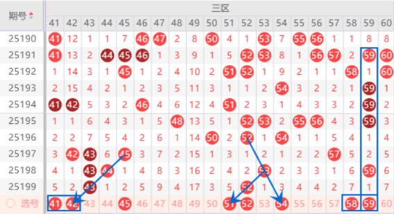 该区间42号数字也是属于斜四连号,本期出号机会也是有的,我们可以关注一下41 42号数字同出的情况。本期的45号数字是属于对应斜连号码,本期可以防守一下出号情况。本期的51号数字我们注意一下出号情况,属于三斜连号码,本期可以防守一下50 51号数字或者51 52号数字同出的情况。本期的52 54号数字是属于交叉对称号数字,是有机会出一个号码的,我们可以关注一下。本期的59号数字也是有属于121走势,出号机会是有的,我们可以防守一下58 59号数字同出的情况。