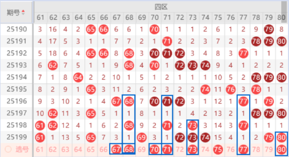 该区间的68 71 77号数字都是属于空一对称号码,本期我们注意一下出一个号码的情况。本期的63 67号数字都是属于空三中心号,本期我们注意出一个号码的情况,其中的67号数字可以重点关注一下。本期的70号数字是属于斜连号码,出号机会也是有的,我们可以关注一下出号情况。本期的75号数字我们防守一下75号数字的出号情况,属于对应号码,出号机会是有的。本期的79 80号数字我们注意落下一个重号的情况,本期可以防守一下78 80号数字同出的情况。