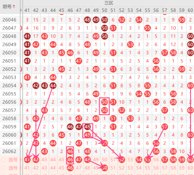 而三区的打底号是42.46.47.50.52.53.55.59.60中参考3-4码开出机会,
