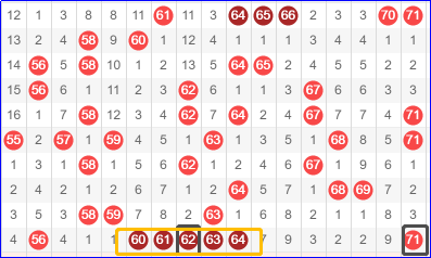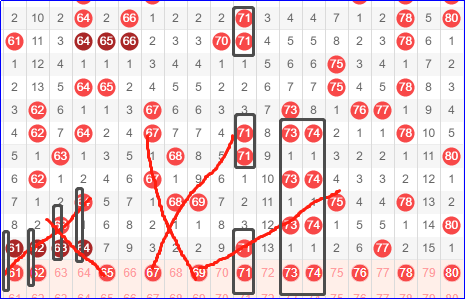 第四区间号码61-80,第311期咱们成功在本区预测了62和71,不知道各位抓住了没有。随着五连号的出现,那这一期依然是有着一定的走势号码会出现,注意黑色标注的号码。