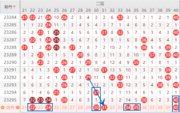 该区间上期开出了三连号22 23 24,本期这里是要出重号的,我们重点考虑一下22 24的出号情况。本期的31号数字我们要注意一下,在该区间31 34 37是属于1路号码,已经遗漏4期没有出过号码了,所以本期我们要注意一下出号情况了,重点考虑一下31 34号数字的出号情况。上期开出了36号数字,本期我们注意一下带出35号数字的情况来。本期的40号数字我们注意一下出重的情况。