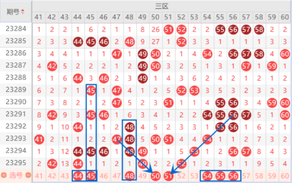 该区间的44号数字上期出现了2重号,本期我们注意一下出现3重号的情况。本期的50 51号数字我们要注意一下,都是大长斜连号码,有可能会把这里堵起来的。连号56 57上期没能出重号,本期我们注意一下落下一个号码的情况,重点关注一下56号数字的落号情况。
