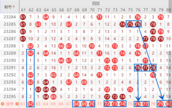 本期的62号数字我们要注意一下出号情况,他是属于空二对称的号码。本期的68号数字我们要注意一下出号情况,在尾数上属于大连号落号情况,出号机会是很大的,我们要注意了。注意68 69同时出号的情况。上期开出了三连号72 73 74号数字,本期我们要注意一下落下重号的情况,防守一下72号数字的出号情况。连号76 77本期有机会落下一个号码来,本期我们要注意了。本期的79号数字是属于遗漏8期的号码,本期遗漏8期的号码也是有3个号码,出一个的机会还是有的。
