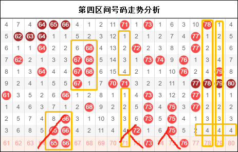 四区昨晚75还是如月出现了,回不了73和77的三重号。从昨晚的开奖号码来看,这一期似乎在四区找到了一点感觉,有了一点要回暖的迹象,所以本期注意在四区可以适当布局了。从四区近期的整个走势来看,不管其他区间怎么变化,四区倒是比较特立独行,依然是保持了自行的走势,所以本期更多的机会不妨试试邻号。