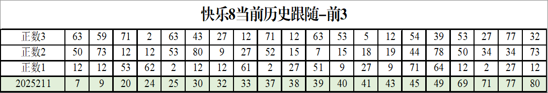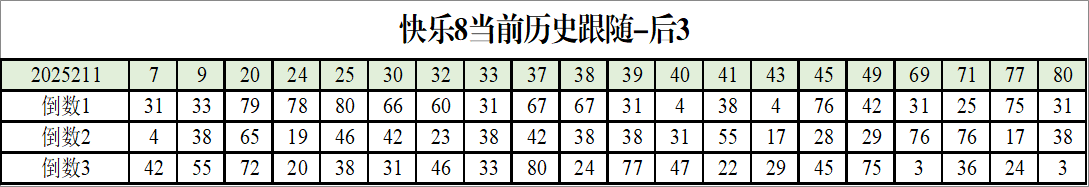 我感觉选热的同时,还要注意防冷条件开出,可以直接选取每个号码跟随出次前三的号码,也可以考虑把出次最后的三个数字加进去,不过这样可能号码太多,可以尝试。图上也能看出单独号码跟随的情况,我就不一一统计每个号码的出次了,我这里考虑提高概率,取每个号码历史跟随的前三号码和后三号码,根据2025211期的号码,我关注正数3和倒数3的号码号码为:
