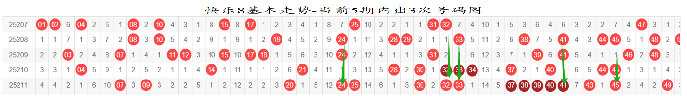 这个条件可以理解为追热号,主要是选取遗漏小于5期的号码来做大底,通过号码分布图我们也能看出,每期都有重复号,都有上期号码的相邻号,再仔细观察下面的部分分布图,2025211期,按照【号码(遗漏)】的方式统计出来是:7(1),9(5),20(6),24(1),25(3),30(0),32(0),........。可以看出遗漏小于5的号码比较常见,这就是一个大概率事件,我们就可以用这个梳理出一部分号码,用来作为我们交集的一组号码。