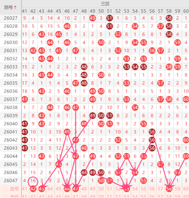 三区间在近期的走势上分析,上期三区间开出了3码,而且整体区间还是一个温热形态,上期三区间开出的形态是重码和孤码分边走势,上期小妹在文章中布局到了2码开出,那么本期三区间我们要重点关注的形态是空位回补,对称形态,那么本期首先注意空位回补上的42.44.46.58中布局1-2码机会,而对称形态上的43.47.中参考一码开出机会,上期重点关注在重码走势上开出了1码,那么本期重点关注在隔期回补上布局一码机会,如图所示。