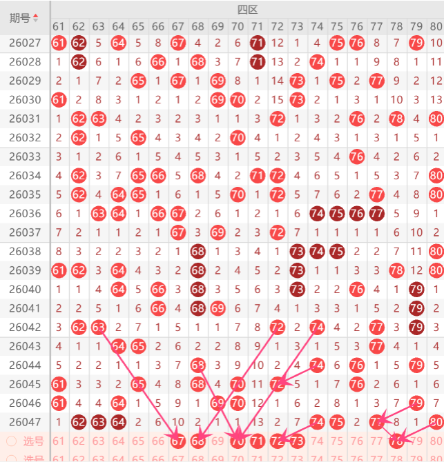 四区间的打底号是64.65.66.67.68.70.71.72.74.76.78参考4-5码开出机会
