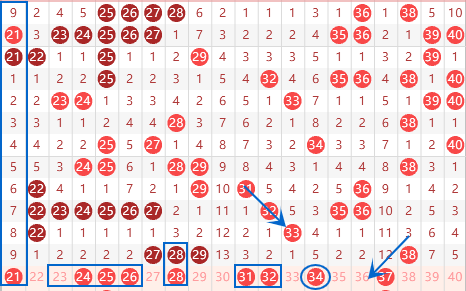 本期的21号数字是遗漏9期的号码,本期遗漏9期的号码有2个,我们要注意出一个号码的情况,所以本期的21号数字我们可以注意一下。连号23 24 25 26本期我们也是要注意落下号码的情况的,重点关注一下24 25 26的落号情况,在这里也是可以定一个胆码出来的。本期的34号数字是属于复制号码,我们可以关注一下。上期开出了38号数字,本期我们就要注意冷号37号数字的出号情况了,出号机会还是有的。