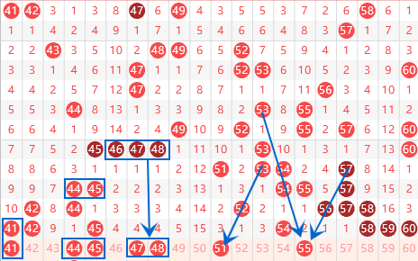 上期开出了41 42连号,本期我们要注意41号数字走重的情况,机会还是有的。本期的44 45我们也是要注意一下,尤其是45号数字出重号的情况很大的。连号46 47 48本期落下一个号码的情况是很大的,我们可以在这里定一胆码了。重点关注一下47 48的出号情况。本期的51号数字是属于三斜连号码,我们可以防守一下。55号数字上期很好,没能开出来,本期我们在防守一期看看。