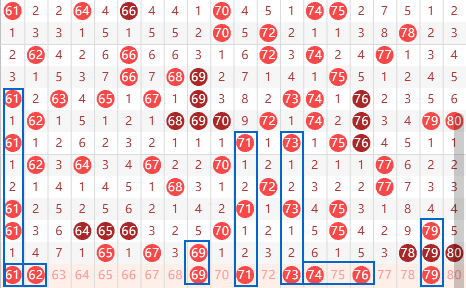本期的61号数字是属于121走势,本期的121走势有3个为17 61 70,本期我们要注意出一个号码的情况。本期的69号数字我们要注意出重的情况,上期的65号数字我们就没有做了,本期的69号数字我们可以小防一手。本期的71 73都是属于空二对称,本期我们要注意出一个号码的情况,本期的79号数字我们也是要注意出三重的情况的。