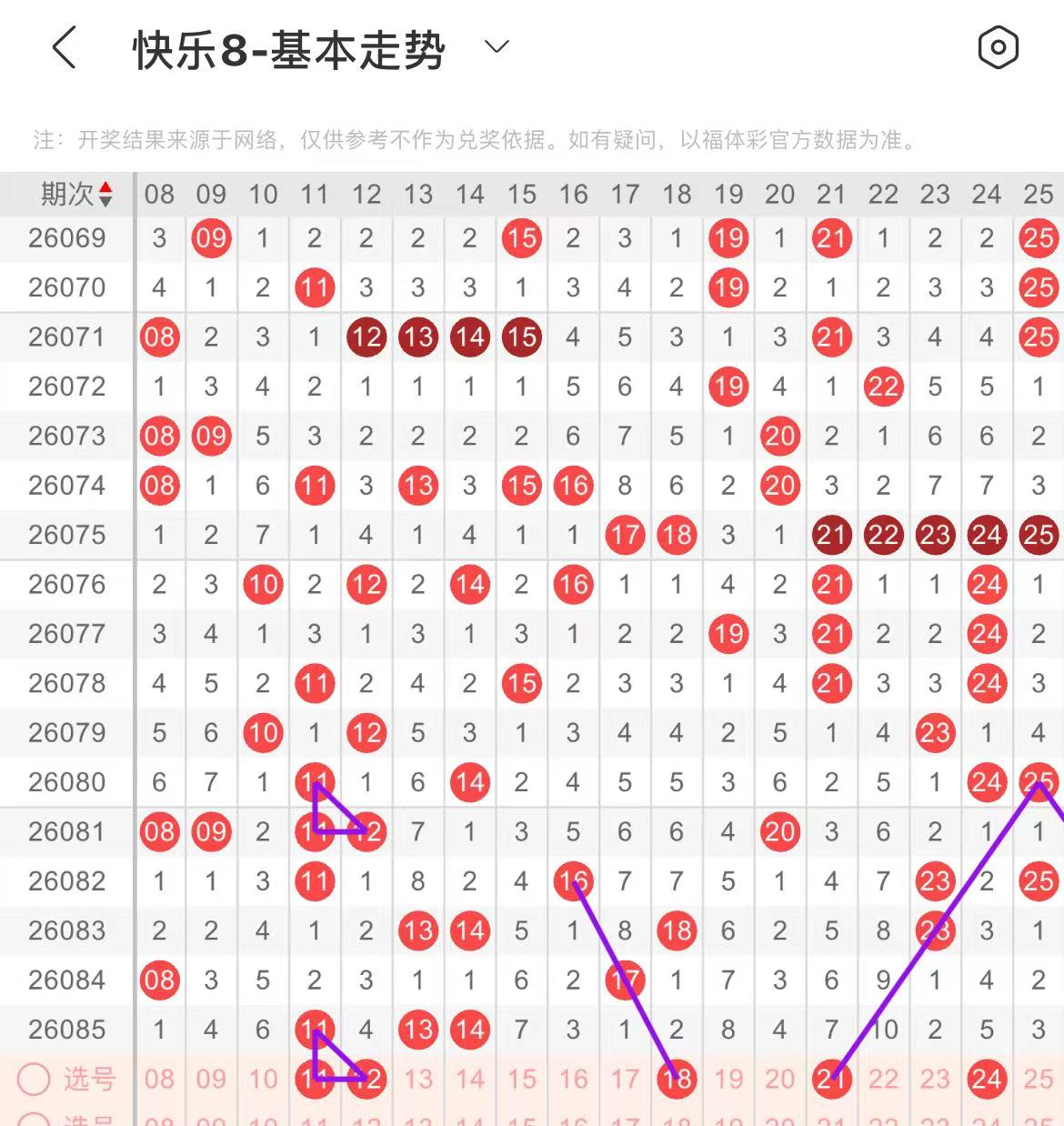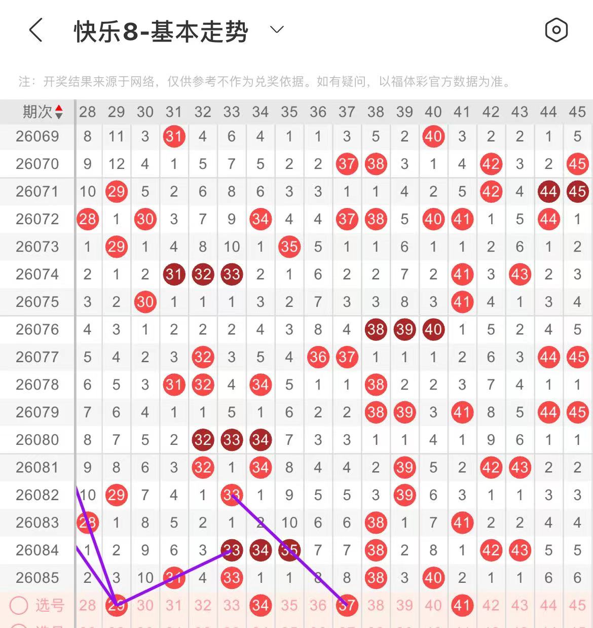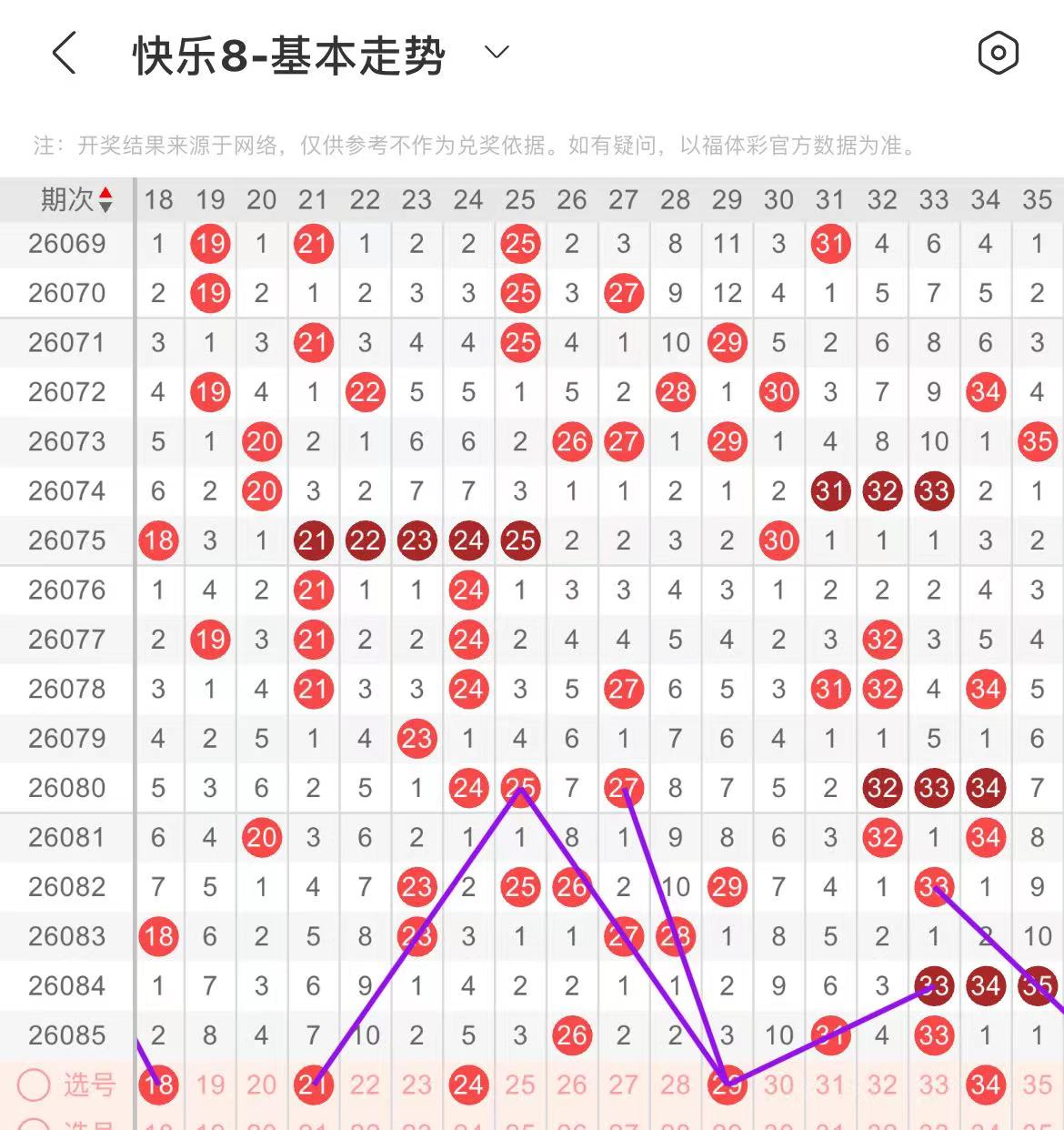 21-30区:本区间上期开出了一个号码,从号码走势图上看,该区断区后只回补了一个号码,本期继续关注该区号码持续回补,出号个数在两三个号码之间。有出号走势的号码有21号,斜连出号走势,防21.24组合号码回补,29号,三线斜连出号走势。