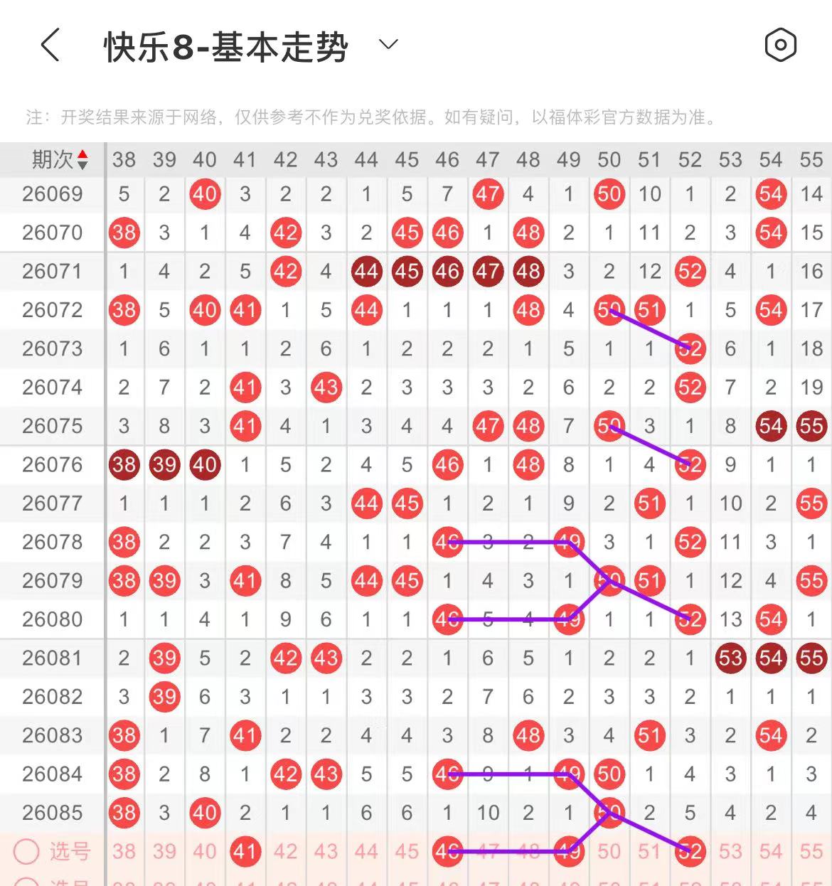 51-60区:本区间上期开出了两个号码,从号码走势图上看,该区现属于温号区,不过,走冷趋势明显,在选号上需谨慎,出号个数在一两个号码左右,有出号走势的号码有52号,50对应52出号走势,59号,斜连出号走势。