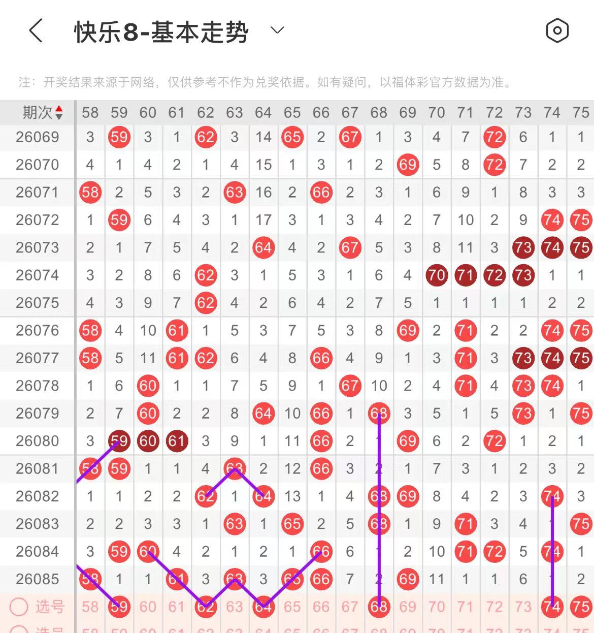 61-70区:本区间上期开出了五个号码,从号码走势图上看,该区现属于热号区,出号个数应该还能保持在三个号码左右,有出号走势的的号码有62.64号,直接考虑做分边出号,68号,上下对称出号走势。