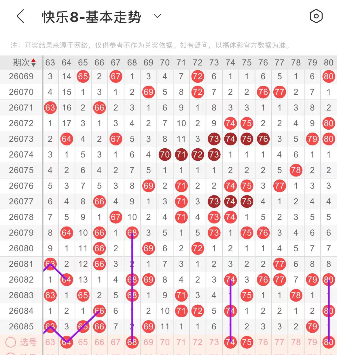71-80区:本区间上期开出了一个号码,从号码走势图上看,该区现属于温号区,上期出号个数减少,本期注意出号个数增加至三个号码左右,有出号走势的号码有74号,隔期相同出号走势,防74.75同出,80号,隔期相同且为边号出号走势。