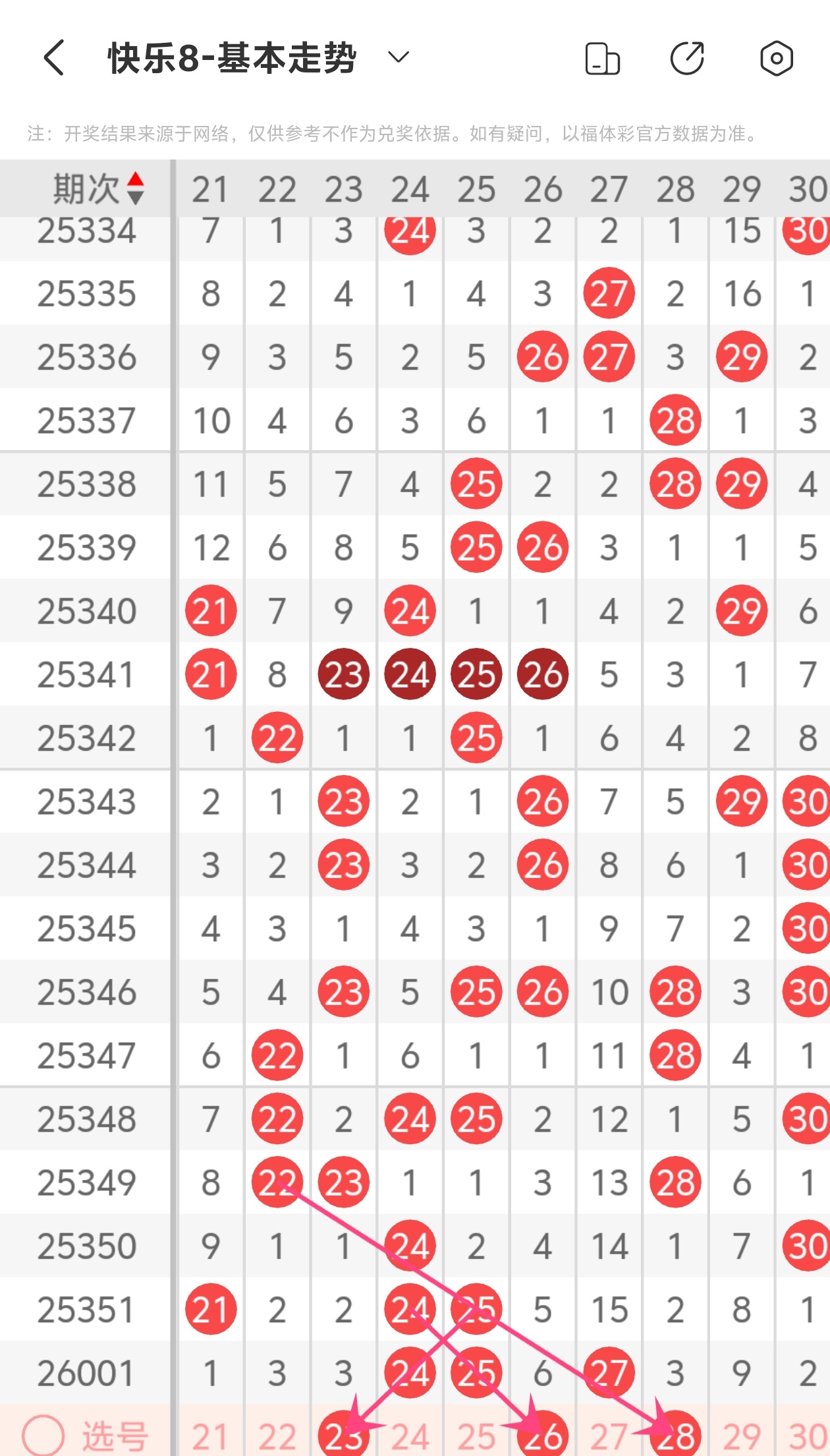 上期第三区间开出24 25 27,本期我们可以从上面走势图中看到选号的思路,本期推荐23 26