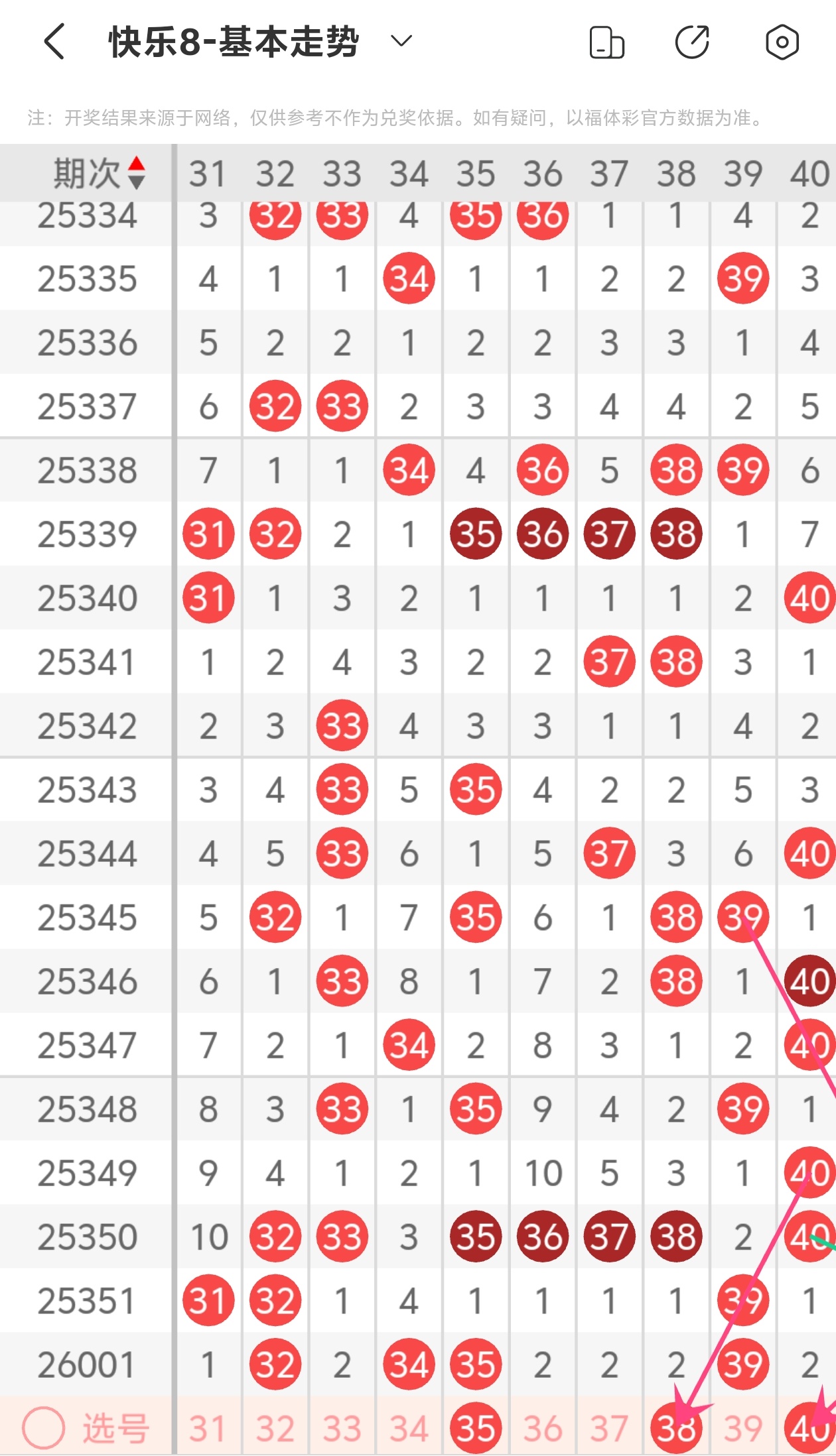 上期第四区间开出32 34 35 39,本期我们可以从上面走势图中看到选号的思路,本期推荐38 40