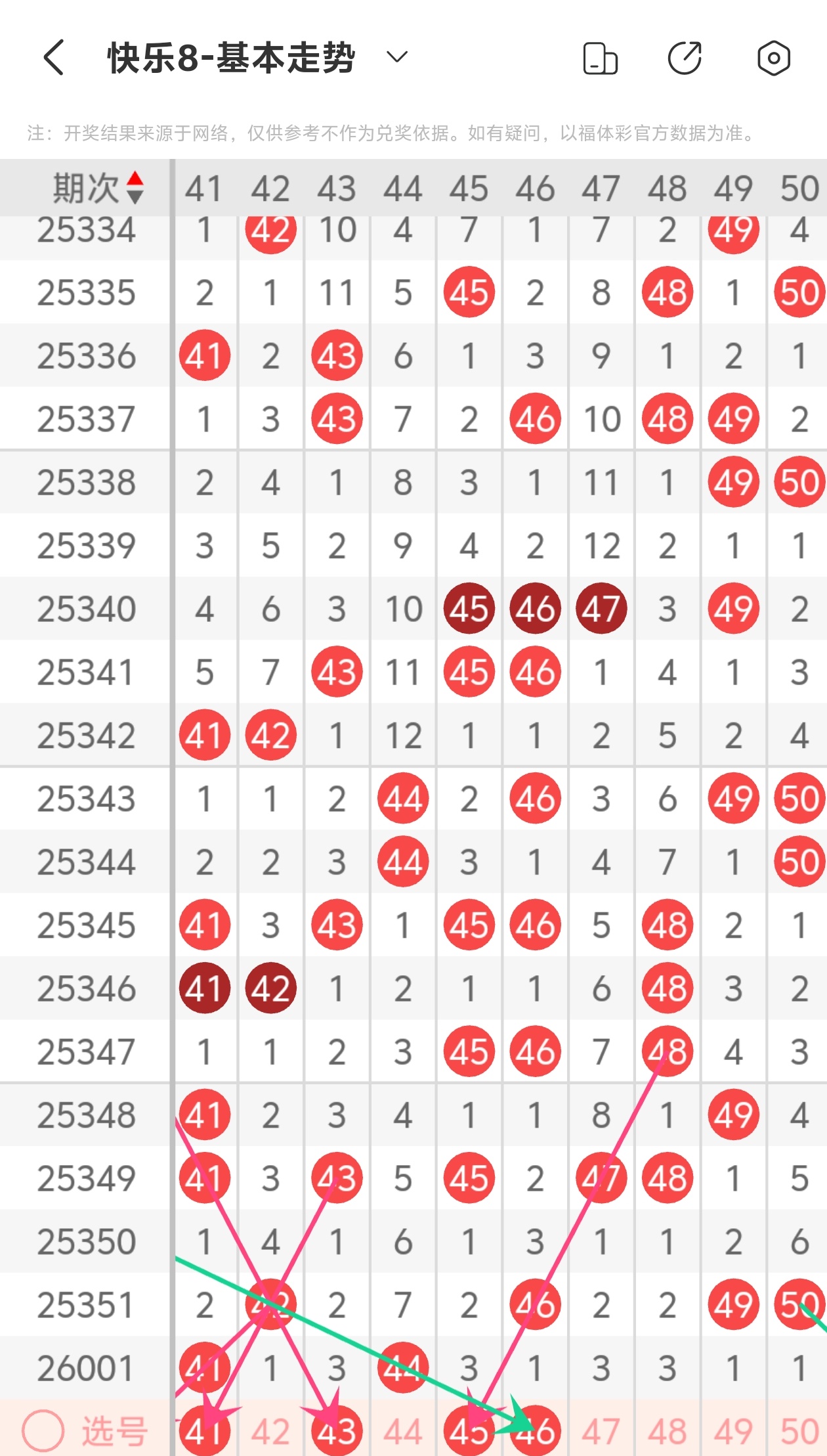 上期第五区间开出41 44,本期我们可以从上面走势图中看到选号的思路,本期推荐41 43 45