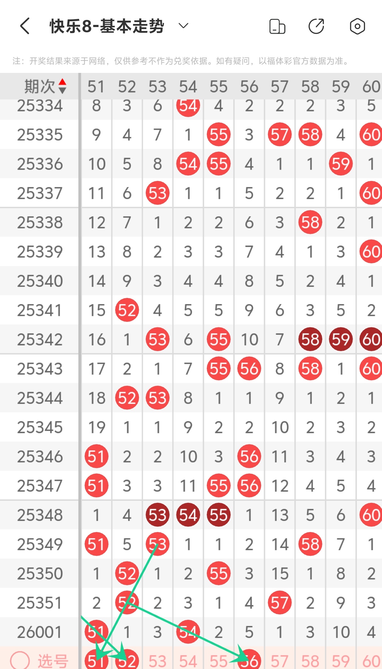 上期第六区间开出51 54,本期我们可以从上面走势图中看到选号的思路,本期推荐51 52 56