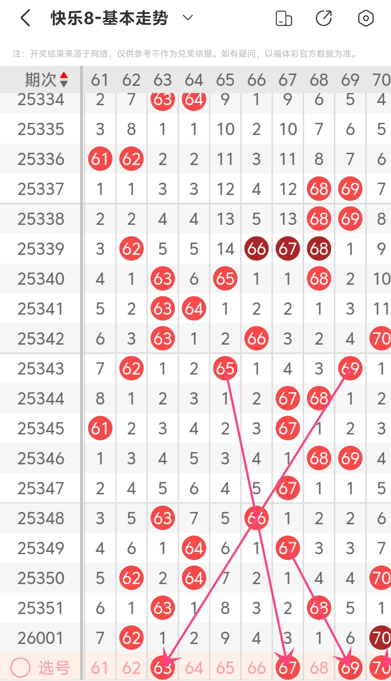 上期第七区间开出62 70,本期我们可以从上面走势图中看到选号的思路,本期推荐63 69 70
