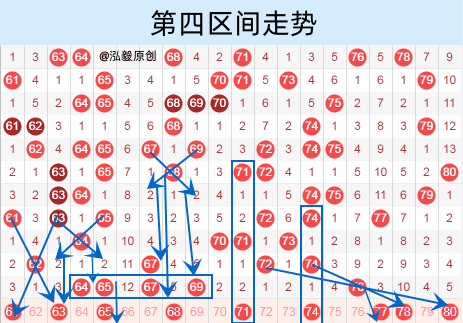 上期开出的64 65 67 69是属于3连空一出号,那么本期这里我们就要注意出现一重号和一夹号的情况了,由于上期没能开出来,本期就很容易出了。连号空一带号70 71 73已经连续两期没有出现回补号了,那么本期就应该要回补一个号码了,我们要注意一下,本期的80号我们要注意了,本期的01号应该要断号了,80号我们必须要做好防守。