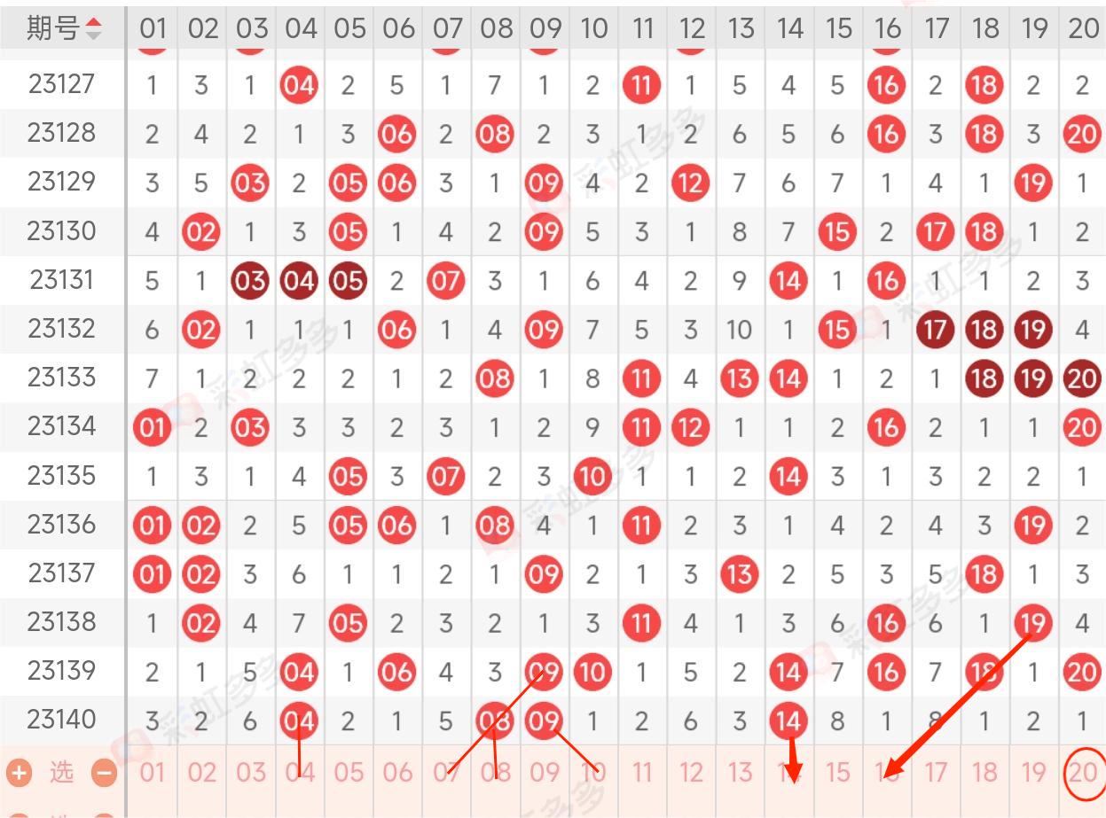 首先回顾上期的开奖号码:04 08 09 14 22 28 41 43 44 46 51 55 57 59 60 63 69 71 72 80